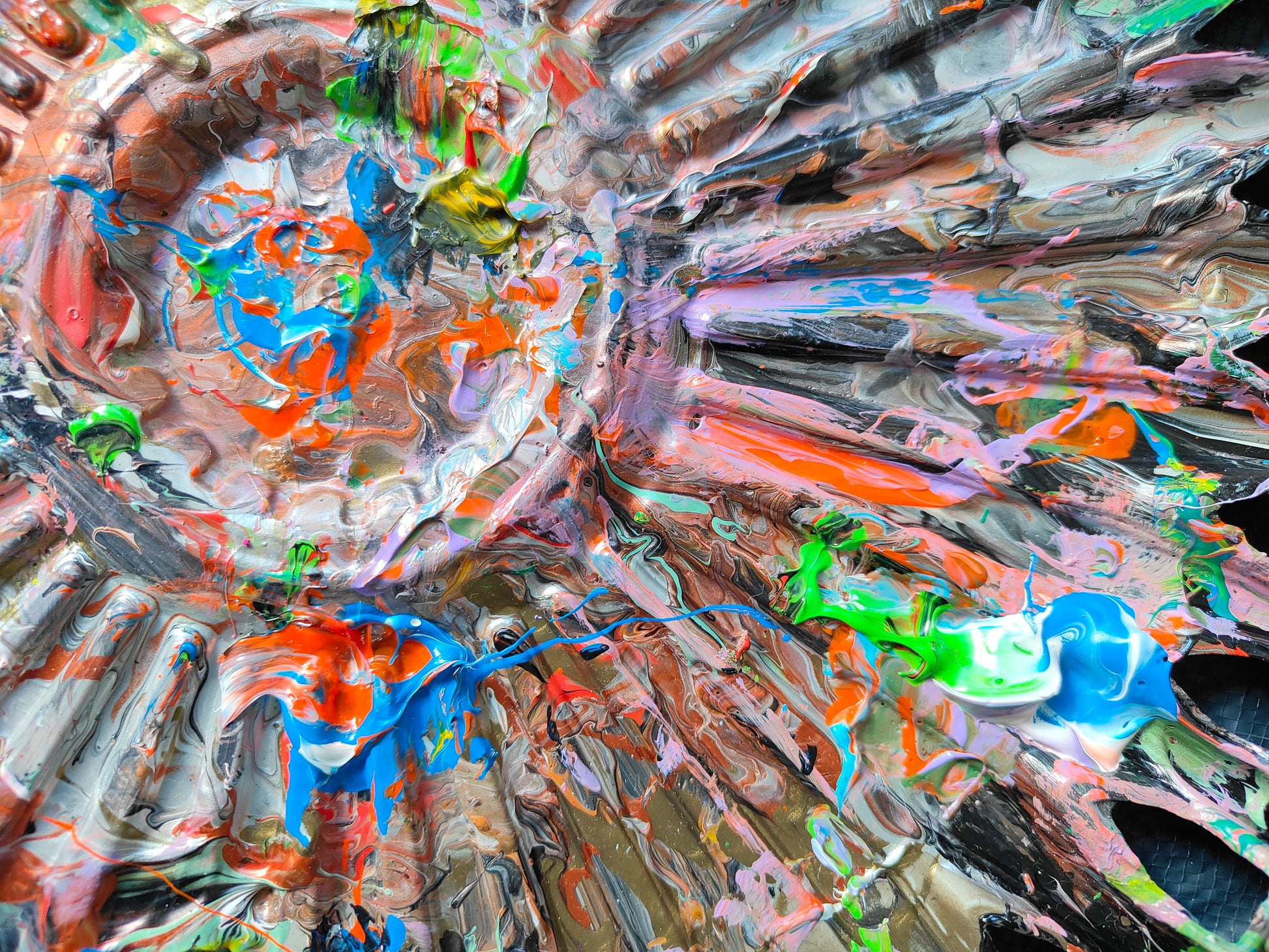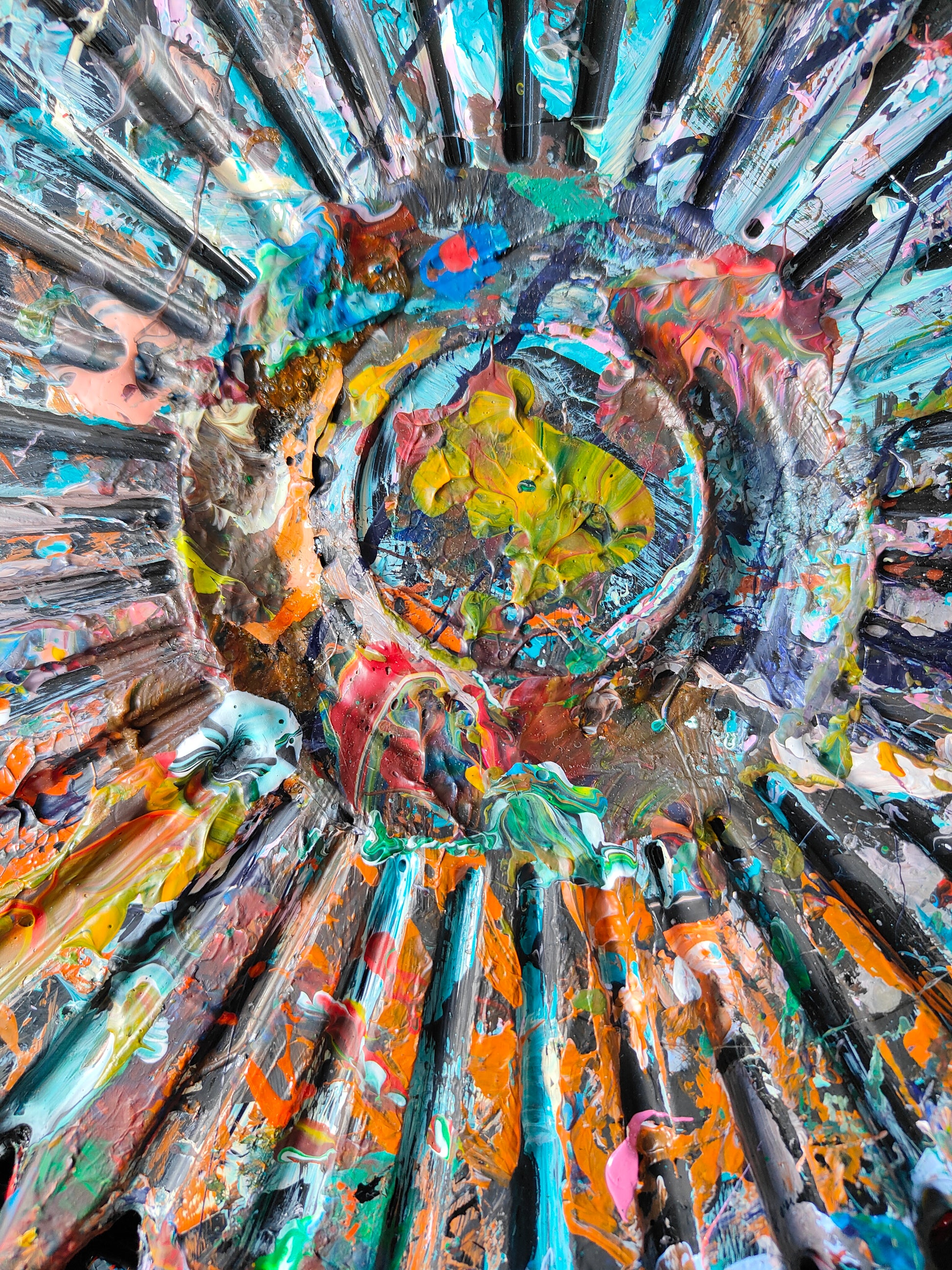 Layered metallic & pastel acrylis & strong glues on metal & plastic. 0410 diameter x 0055 height in millimetres. Previously at Rural Planning Services (RPS) Sydney office & faithfully creturned in time for Christmas. An arguably arcane & abject masterpiece post-industrial, in another sense primitive, subtle, strange, & allegedly anti-academic. Is it an exception to Oscar Wilde's dictum, "All art is quite useless" since, you know, one could use it as a fifteen inch hubcap? Sure.
